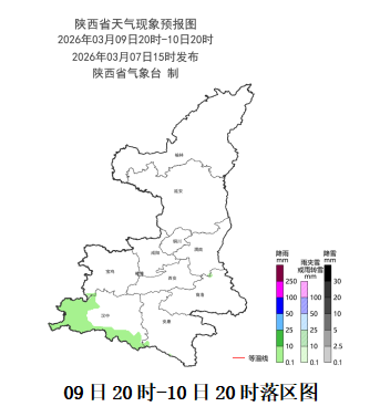 3月9日 20时- 3月10日 20时: 全省好天间多云。陕南西部有小雨(0~1毫米)。