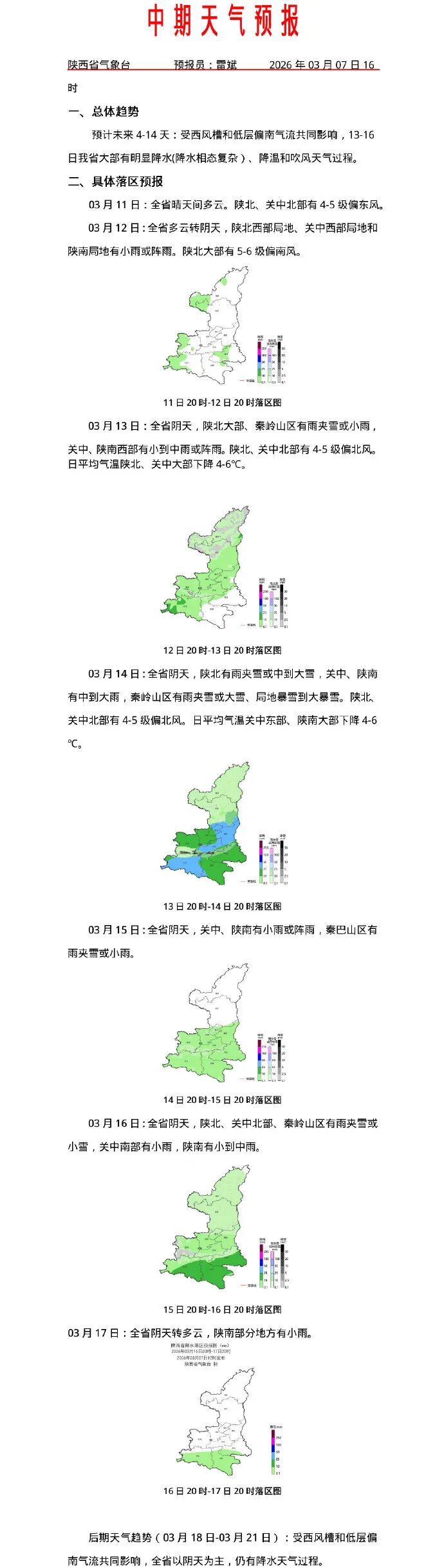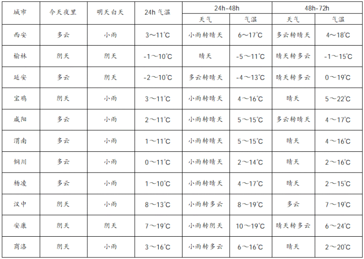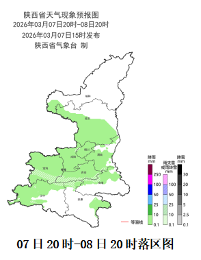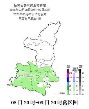 3月8日 20时- 3月9日 20时: 陕北、关中阴天转多云,陕南阴天间多云。关中部分、陕南部分场地有小雨(0~5毫米)。秦岭山区局地有小雪或雨夹雪(0~3毫米)。夜间关中部分、陕南部分场地有轻雾,秦岭山区局地大雾。