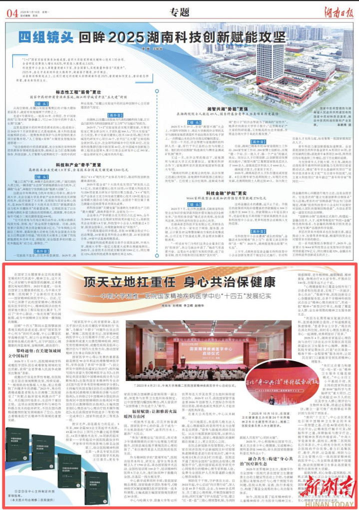 本文原载于1月19日《湖南日报》04版面 周阳乐刘明辉李卫晖赵晓华 {jz:field.toptypename/}在国家卫生健康事业迈向高质量发展的时代洪流中,精神卫生,这片关乎心灵安顿与幸福图景的疆域,正承载着沉甸甸的期待。2022年盛夏,一份来自国家卫生健康委的批文,为中南大学湘雅二医院赋予了全新的历史坐标——国家精神疾病医学中心。自此,它与早已深耕于此的国家精神心理疾病临床医学研究中心、精神疾病诊治技术国家地方联合工程实验室比翼齐飞,开启了“双中心驱动、一体化发展”的壮阔航程,成为中国精神卫生领域一艘领航的旗舰。 回顾“十四五”期间从蓝图擘画到落地实践的奋进足迹,面对“国家医学中心何为”的时代命题,中心以攀登医学高峰的锐气、树立行业样板的底气、探索特色模式的勇气,在守护国民心理健康的深蓝海域,奋楫扬帆,破浪前行。