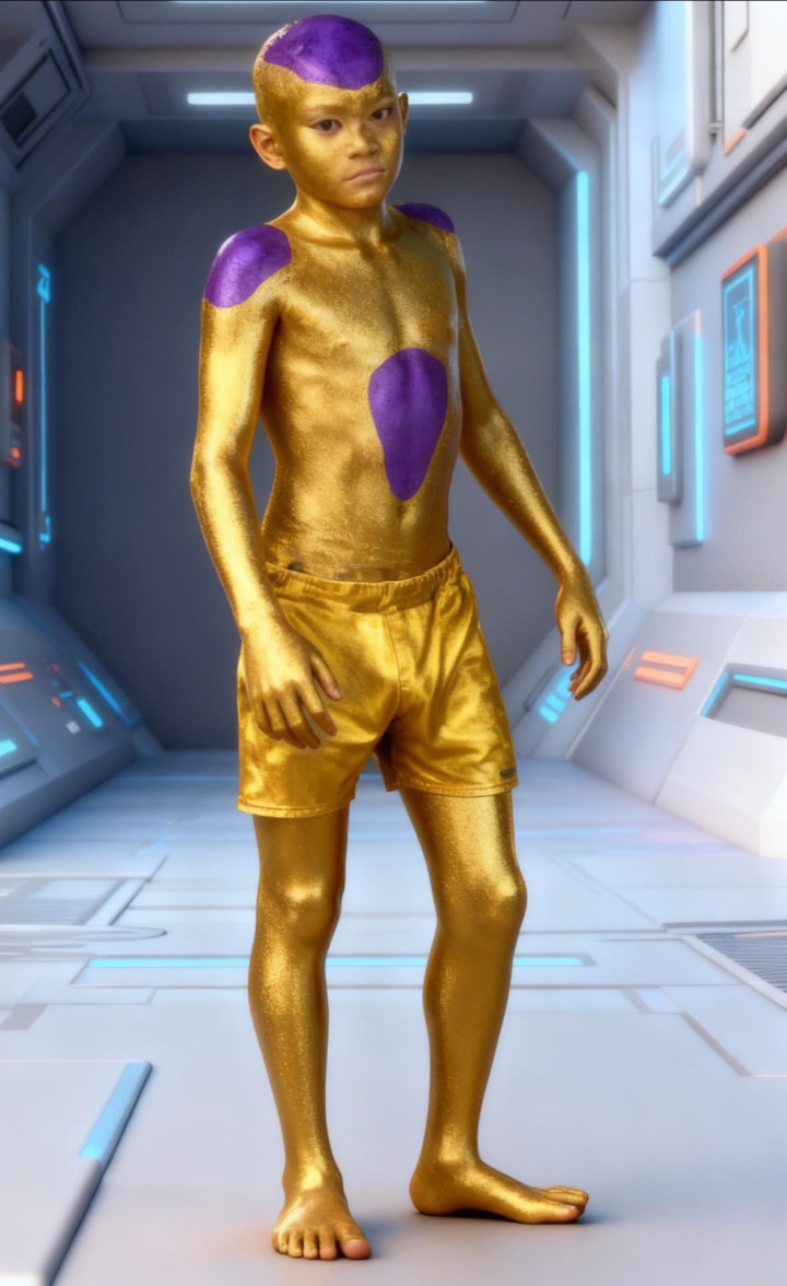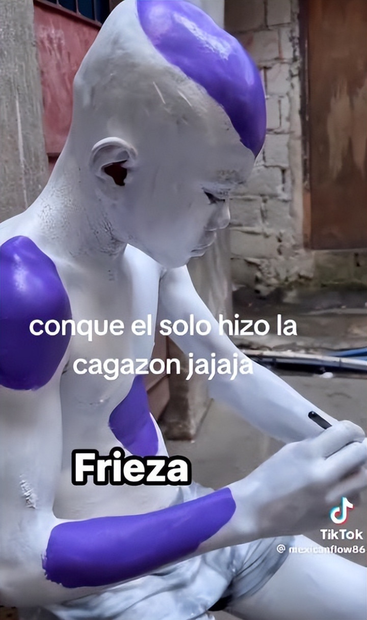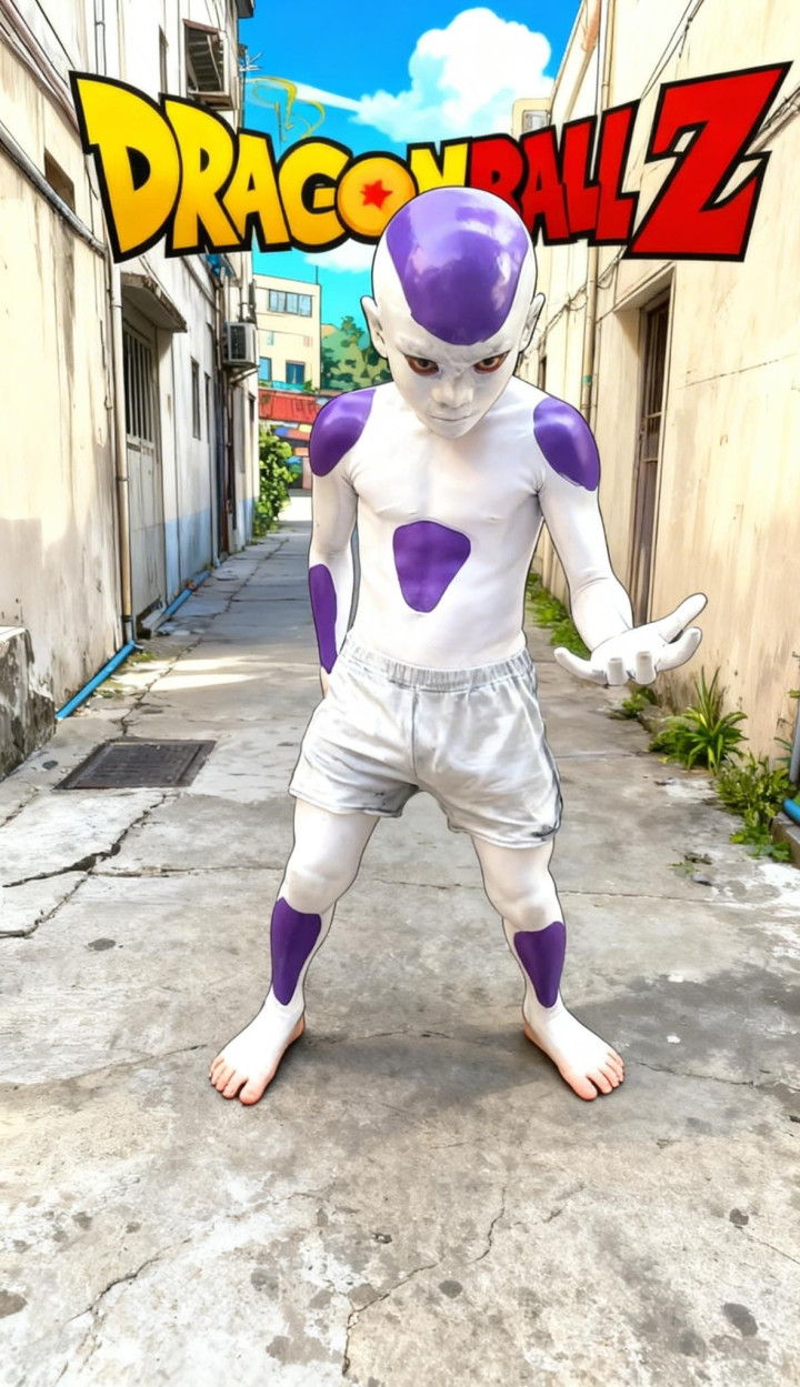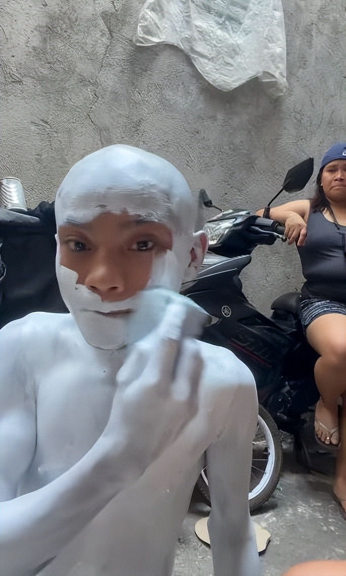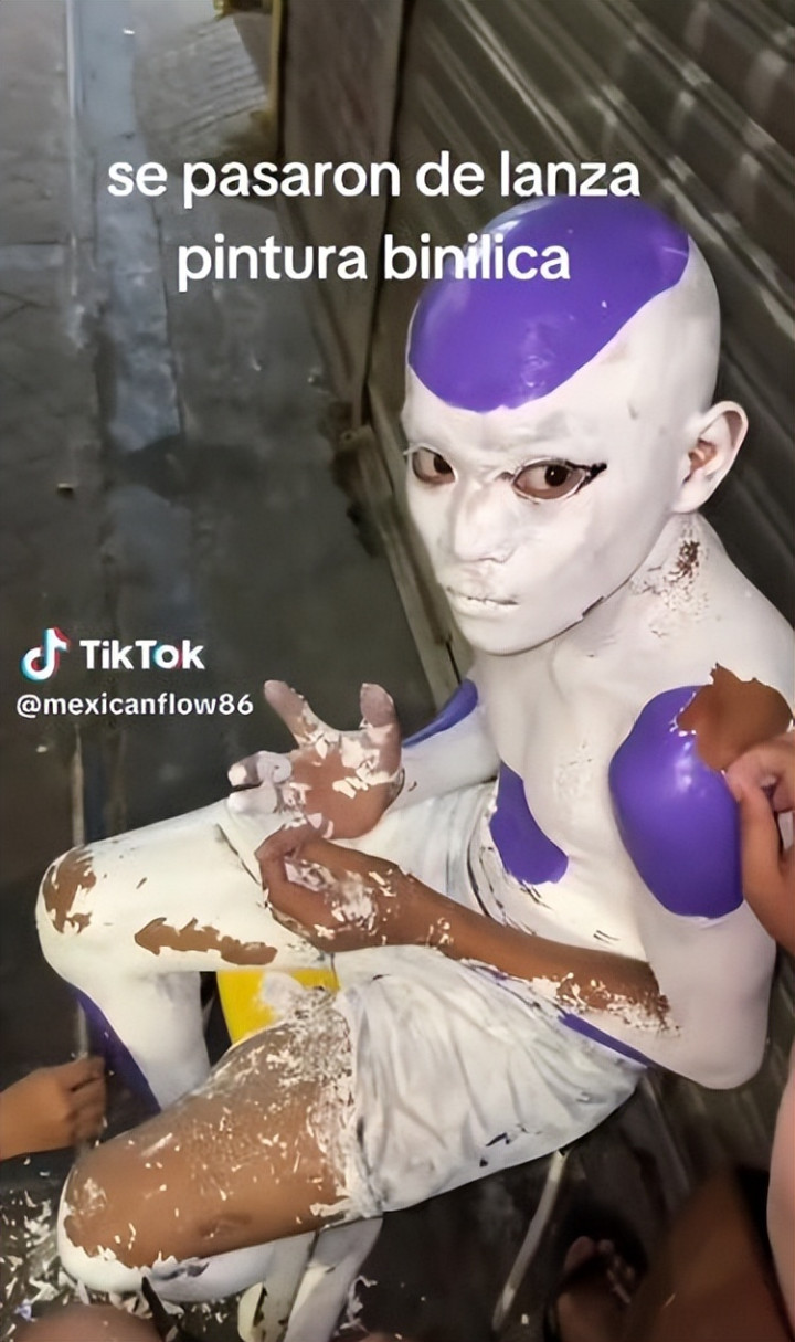 (弗利萨) 不知说念弗利萨是不是少年最爱的变装,但起码应该是他家东说念主最援助上演的变装——因为它cos起来最省钱,也最浮浅。 弗利萨在漫画里有多种不同的形态,其中第四形态跟东说念主类最为雷同。况兼在漫画里就以“赤身”示东说念主,也不需要挑升制作服装,它的“发型”也很浮浅,剃个秃头就处理了。 于是少年运动荡妆了。 他先用乳胶漆把我方全身涂成白色: