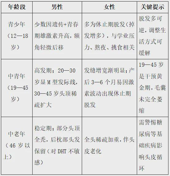 表2:不同年龄段的脱发表现及诱因