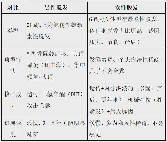 为什么会脱发? 我们头上每根头发都不是“浮在头皮上”的,它的“根”埋在头皮里,这个根就是毛囊——相当于头发的“专属生产基地”,头发全靠它制造出来。 毛囊里最核心的关键部件是毛乳头细胞,它就像生产基地里的“工人”:一方面给头发输送生长必需的蛋白质、维生素等营养,另一方面指挥毛囊持续工作、制造头发,没有它,头发根本长不出来。 头发的生长,会经历“生长期、退行期、休止期”三个循环阶段。健康状态下,每天会有50—100根头发自然脱落(进入休止期),同时有等量新头发从毛囊里长出来,形成“动态平衡”,这就是头发能维持茂盛的关键。 而病理性脱发,本质就是这种“动态平衡”被打破了——简单说就是“掉的头发比长的多”。主要分三种情况: (1)生产基地(毛囊)本身受损、萎缩,生产能力下降; {jz:field.toptypename/}(2)工人(毛乳头细胞)活性降低,没法正常指挥生产; (3)大量头发突然集体进入休止期,出现“批量脱落”。 临床中最常见的三类脱发,核心区别就是——打破平衡的原因不同,具体可以这样分清楚: (1)雄激素性脱发(最常见):主要和遗传有关,体内的二氢睾酮会直接攻击毛囊,让“生产基地”慢慢萎缩,生产的头发越来越细,最终长不出头发; (2)休止期脱发:多是后天因素诱发,比如熬夜、压力大、节食等,这些因素会让大量头发提前进入休止期,属于“批量脱落”的情况; (3)斑秃:属于自身免疫问题,免疫系统会“误伤”毛囊,导致头发突然成片脱落。 脱发常见疑问,一次性讲清楚 Q1:每天掉多少根头发算“危险信号”? A:关键看两个维度:一是“量”,每天掉发超100根,且持续3个月以上;二是“形”,出现发际线后移、发缝变宽、局部秃斑,或头发明显变细变软。如果只是偶尔掉得多,比如换季时,且没有局部稀疏,就不用过度担心,属于正常代谢。 Q2:头发越油,越容易脱发? A:这是大众最易混淆的点,出油本身不会直接导致脱发,但出油多的头皮容易滋生马拉色菌,引发脂溢性皮炎,炎症会刺激毛囊,间接加重脱发。简单说——油不是病因,炎症才是关键,控油的核心是保持头皮清洁,而非过度去油损伤屏障。 Q3:产后脱发会“秃”?多久能恢复? A:产后脱发多是休止期脱发,不会秃。怀孕时体内雌激素升高,头发“超期服役”,产后雌激素下降,这些头发会集体进入休止期,一般在产后3—6个月出现,1—2年可自行恢复。期间不用特殊治疗,注意补营养、保证睡眠即可;若超过1年未缓解,需排查内分泌问题。 Q4:植发后就能一劳永逸? A:不能。植发是“拆东墙补西墙”,把后枕部健康的毛囊移植到脱发区域,移植后的头发不易脱落,米兰app官网版但原生发仍可能继续脱落。脱发治疗需有慢病思维,植发并非一劳永逸,术后必须坚持用药物维护原生发,同时保持健康生活方式,才能保证长期效果。另外,急性脱发期、毛囊资源不足的人,不适合植发,盲目植发可能浪费毛囊资源。 Q5:治疗脱发的药物有副作用?该如何科学应对? A:这是患者最关心的问题之一。从医学临床数据来看,常用防脱药物的副作用并不普遍,无需过度恐慌。具体来看,外用米诺地尔初期出现的脱发增多,是正常的“毛囊置换反应”,持续1—2个月就会缓解,坚持使用才能看到效果;男性口服非那雄胺的性功能影响发生率低于3%,且多为暂时性,停药后可恢复。需要特别提醒的是,药物需严格遵医嘱使用,避免自行调整剂量或停药,若出现不适及时沟通调整,因担心副作用放弃治疗,反而会让脱发进一步加重。 Q6:男性脱发与女性脱发有什么不同?不同年龄有何表现?为什么? A:男性与女性脱发在核心特征上差异显著,且不同年龄段的表现和诱因各有侧重,具体可清晰区分: 表1:男性与女性脱发在核心特征上差异显著
