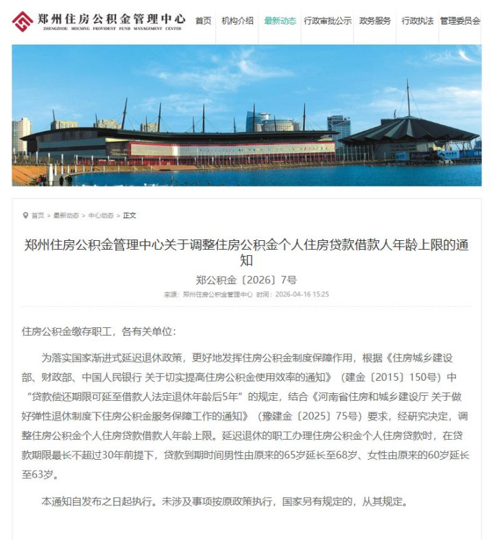 ⭐4月16日,郑州住房公积金处理中心发布见告,转机住房公积金个东谈主住房贷款借款东谈主年齿上限。延长退休的职工办理住房公积金个东谈主住房贷款时,在贷款期限最长不跳动30年前提下,贷款到期时间男性由底本的65岁延长至68岁、女性由底本的60岁延长至63岁。