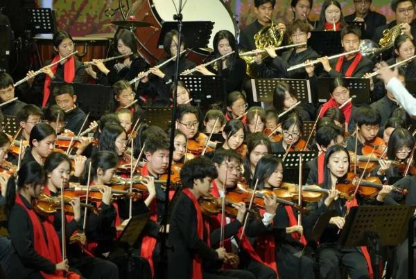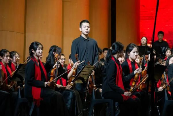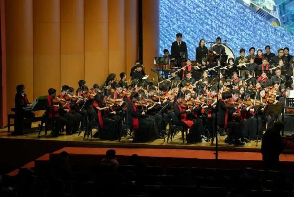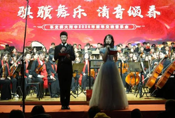 2026年1月17日晚,由东北师大附中主办的“骐骥舞乐清音颂春”新春交响音乐会,在长影音乐厅温情上演。东北师大附中交响乐团以青春之姿、饱满之情,奏响多首动人乐章,在凛冬之夜留下了温暖而澎湃的附中回响。本场音乐会由初二1班张博惟、初一9班谢宛辰主持。 音乐会伊始,东北师大附中初中部合唱社团的同学们以清澈温润的歌声温情开场,为这个夜晚拉开了一段暖意融融的序幕。随后,K歌社团接力登台,以一连串精彩的歌曲串烧点亮舞台,将现场带入首个令人难忘的高光时刻。
