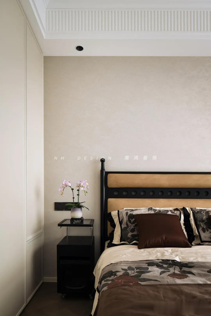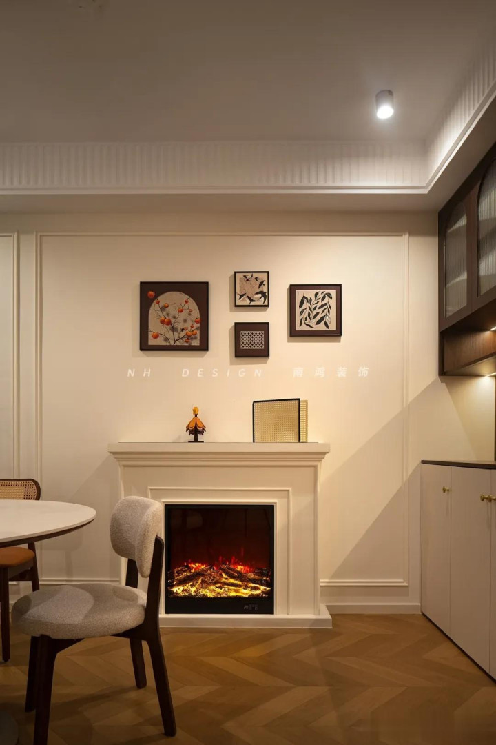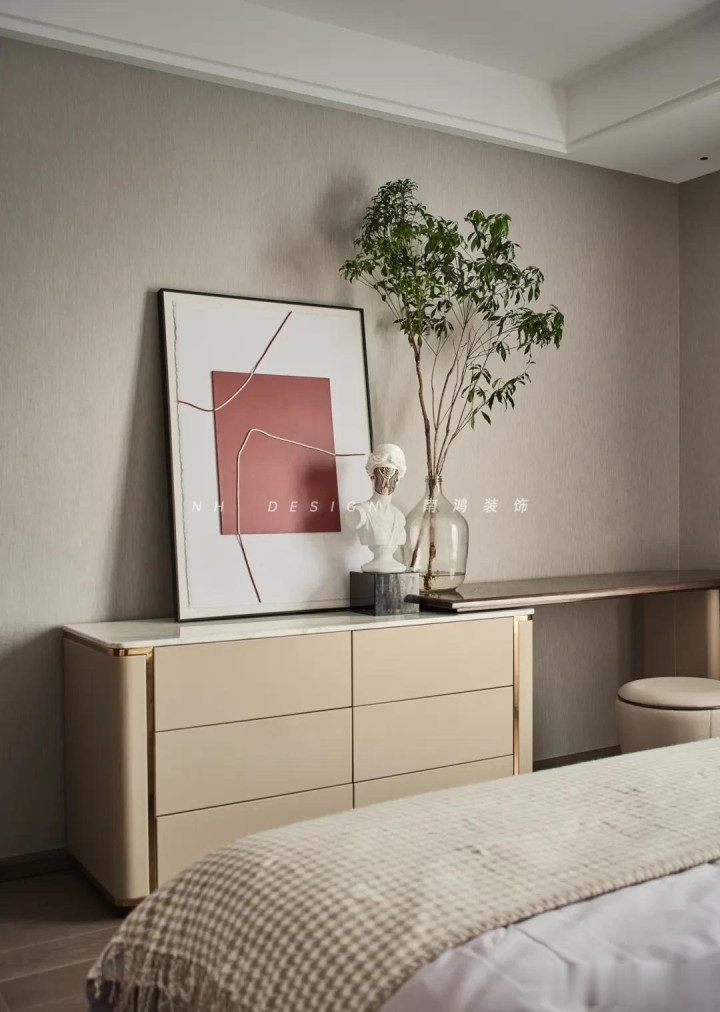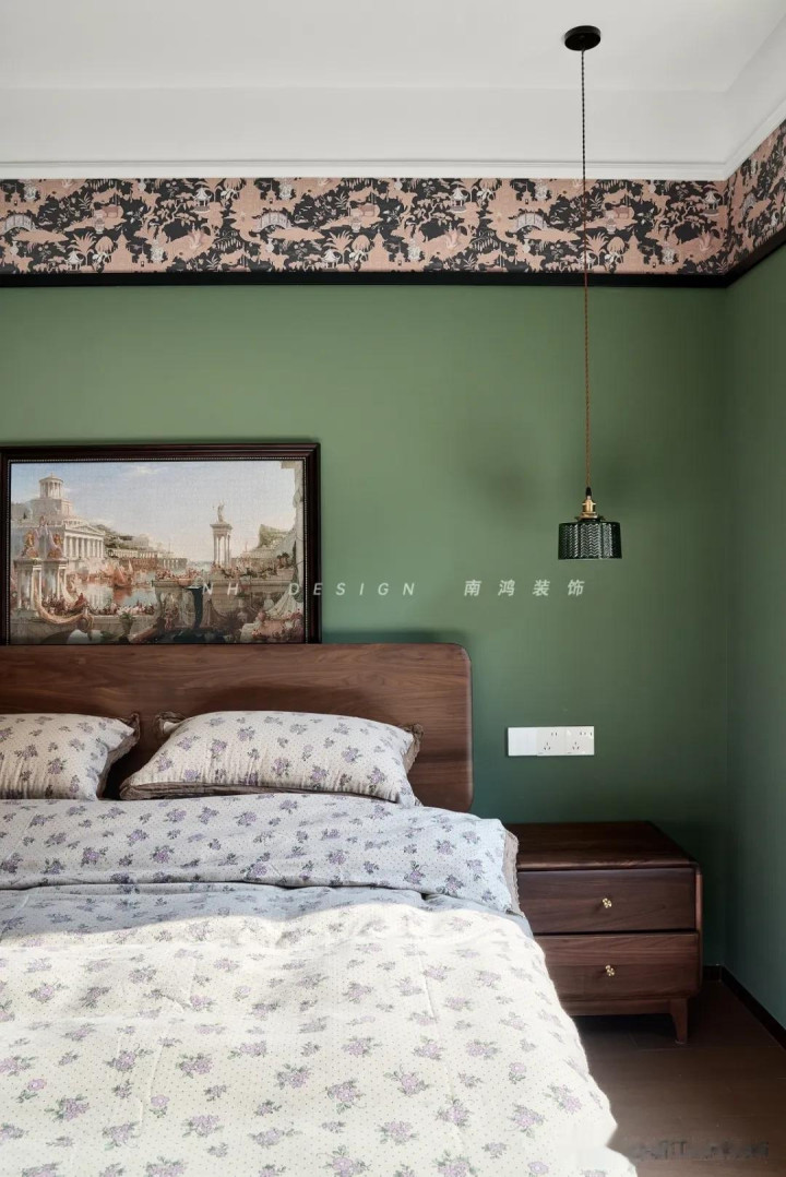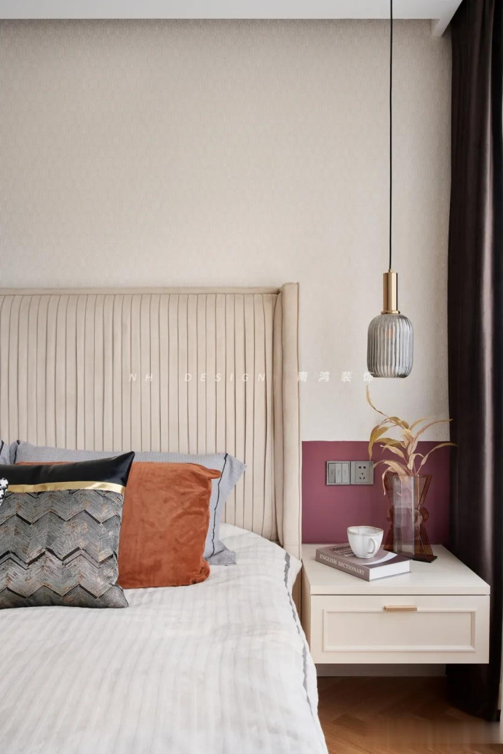 再点缀几幅挂画,空间氛围感一霎拉满! 3)墙布+乳胶漆