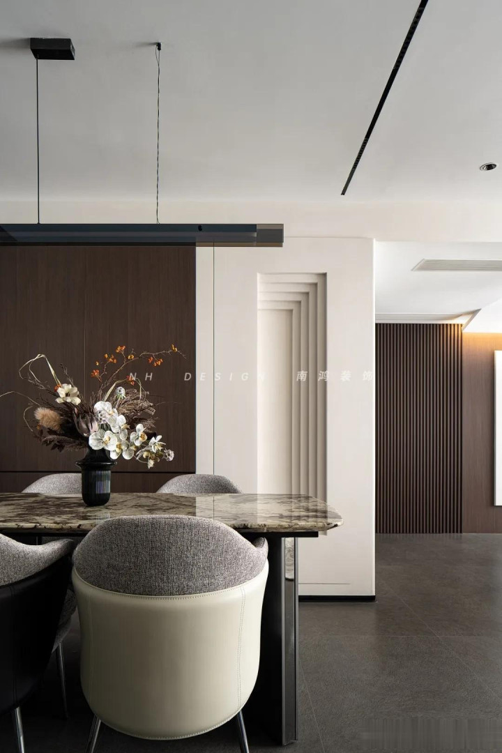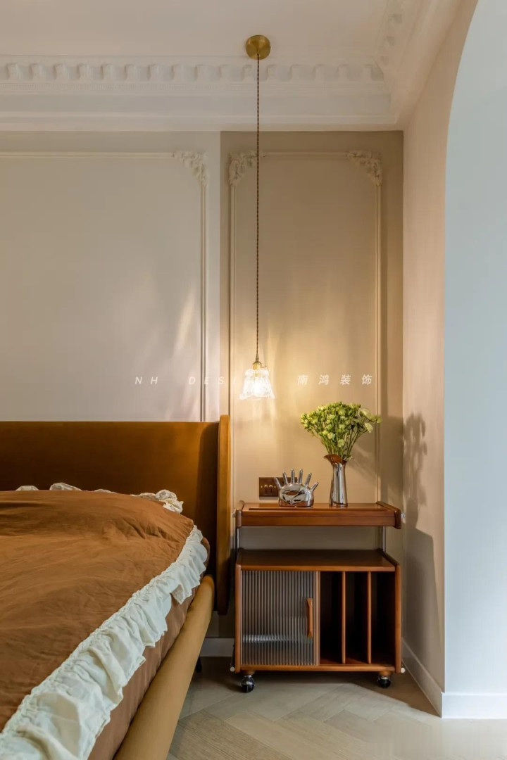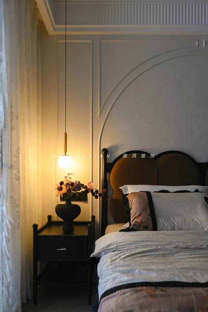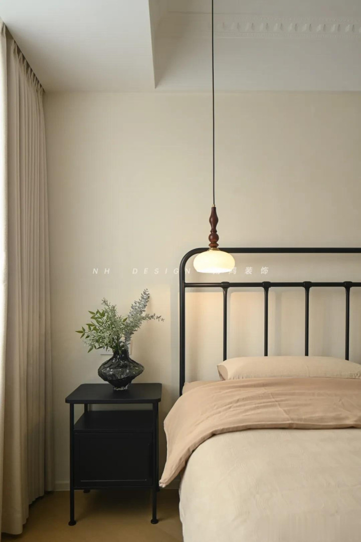 再点缀几幅挂画,空间氛围感一霎拉满! 3)墙布+乳胶漆