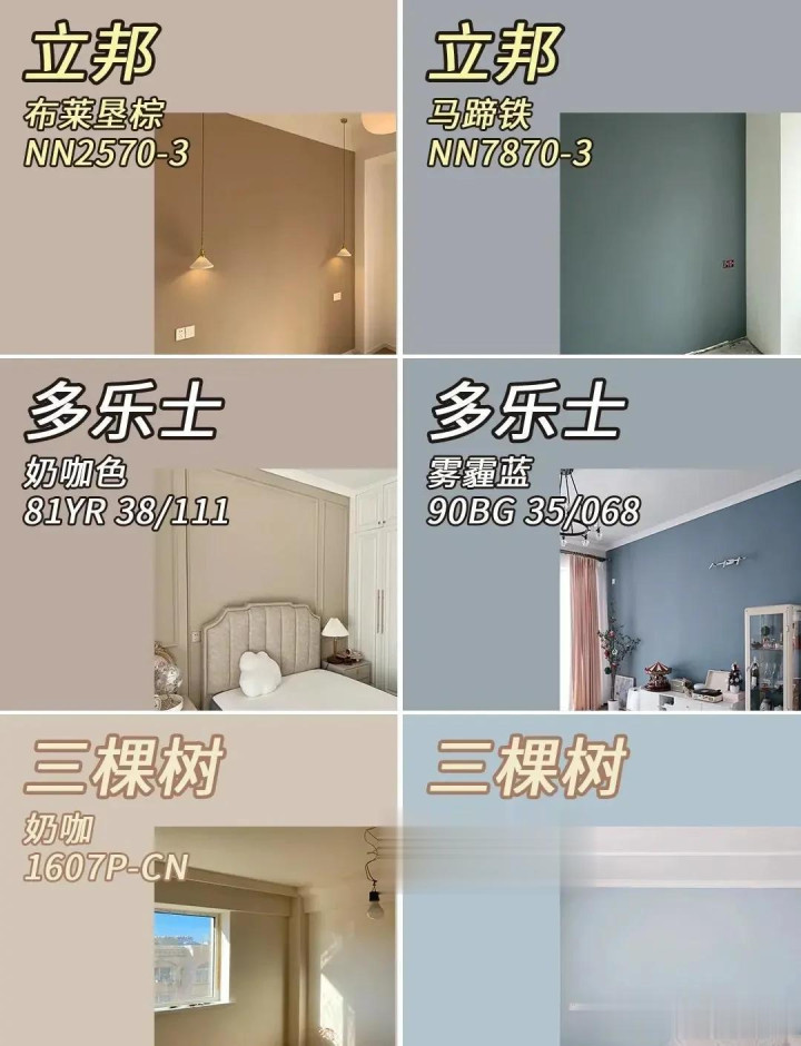 从预算角度研究,排在最前边的大理石、艺术涂料这些确定不可是首选了。 我们就用排在背面的相对平价的几款材料,去作念质感好的配景墙。 01 乳胶漆 乳胶漆行为哄骗最庸俗的墙面材料,性价比最高,当之无愧是首选。 那关于刷漆来说,选对心思,就得胜了泰半。 像全屋通用的淡色有:米白、杏仁白、象牙白、沙色、浅褐色、浅灰色等。 通用的深色推选:巧克力棕、暖木棕、瓦灰色、酒红色、橄榄绿、丛林绿、舟师蓝等。 这里也有一些比较热点的(品牌油漆)色号,大师不错作参考——